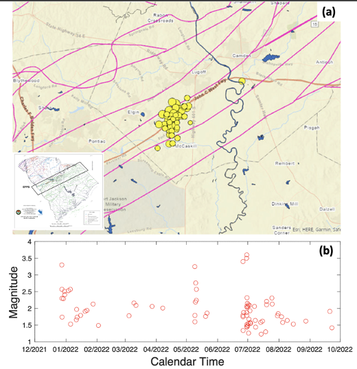 South Carolina has earthquakes! Since the end of December 2021, Elgin, South Carolina has experienced over 80 earthquakes up to a magnitude of roughly 3.5. They are occurring as part of a “swarm”, where there is no single large earthquake but instead many smaller earthquakes of similar magnitudes.